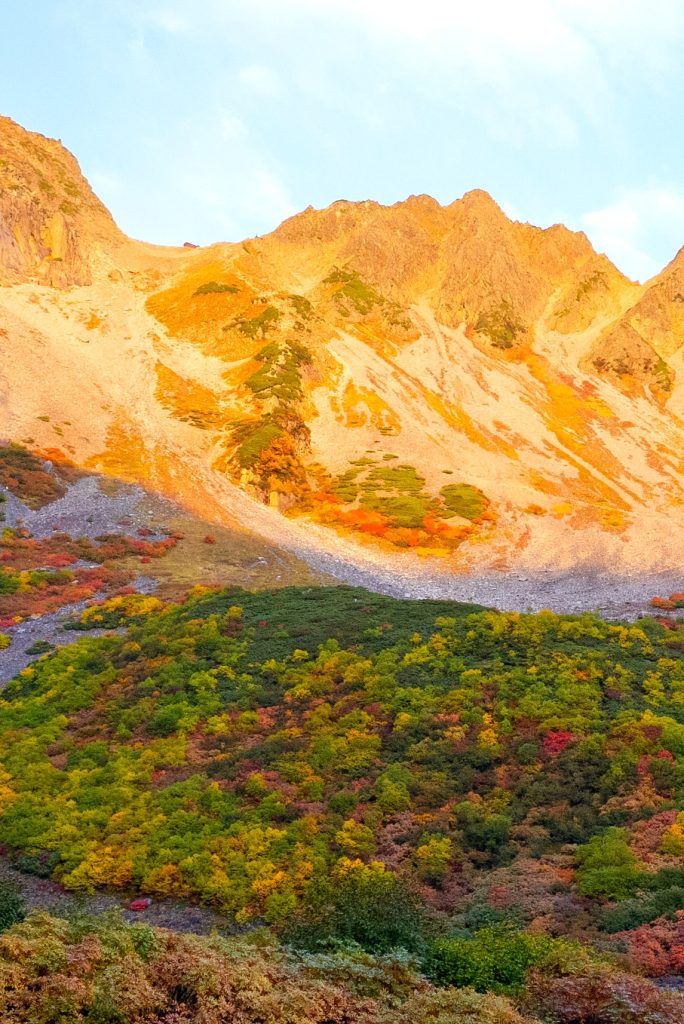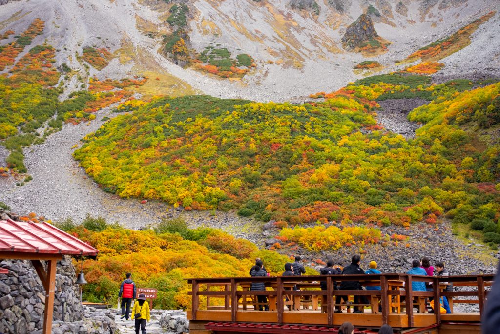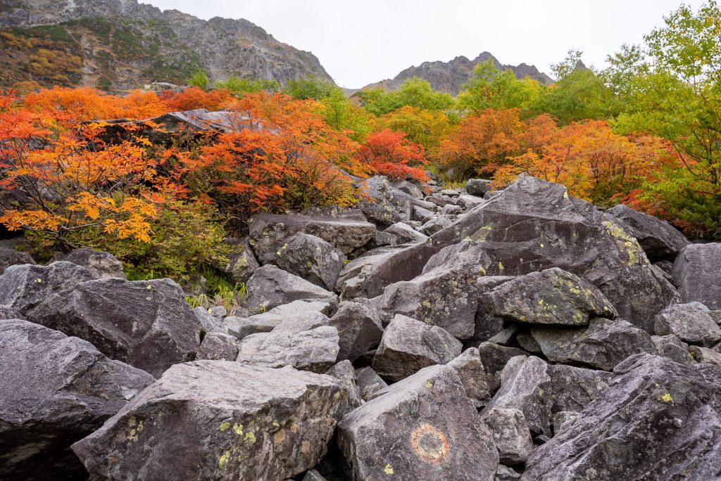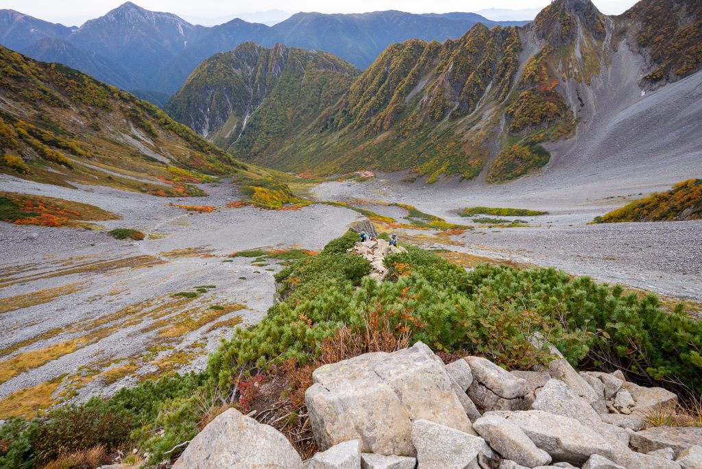 を尻目に、早速ブラブラタモタモ、穂高連峰の中腹に広がる涸沢カールへと向かいます。