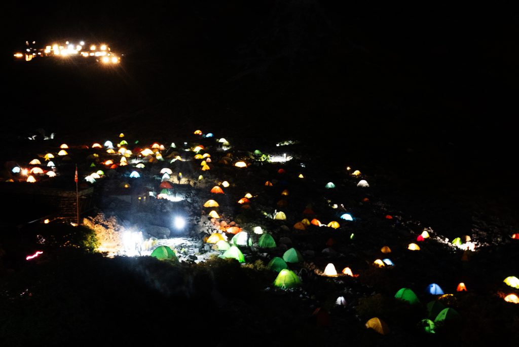 夜、テントの灯りで幻想的。