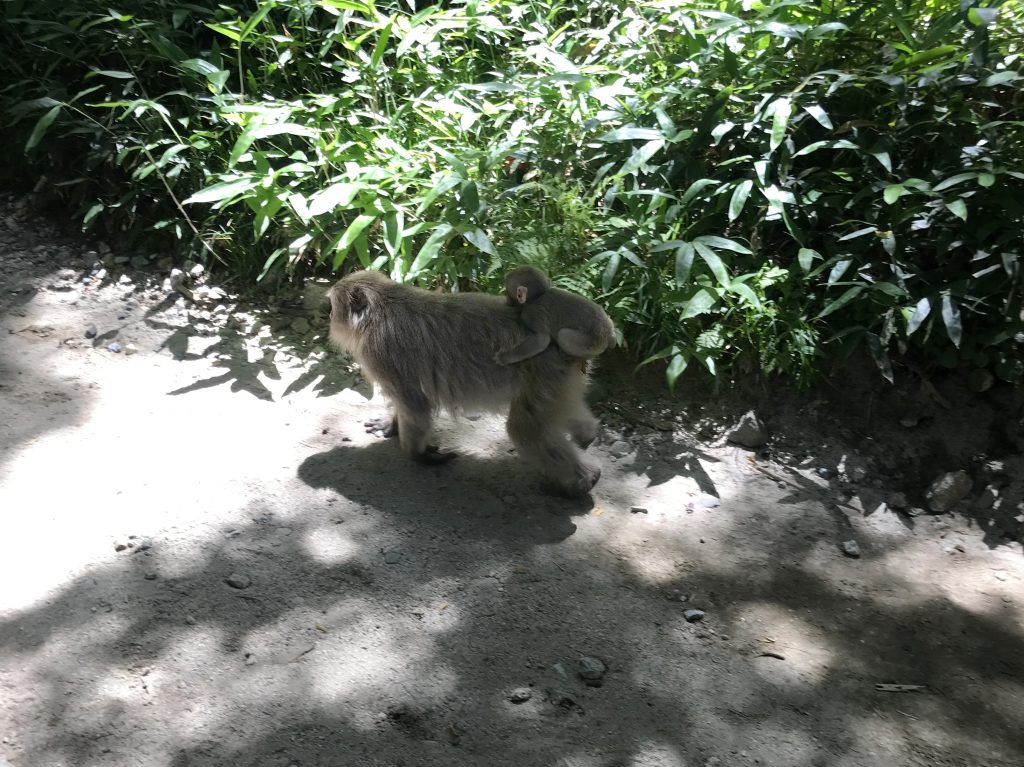 帰りに猿の親子に出会い、自宅で留守番の子供達を思い出す。