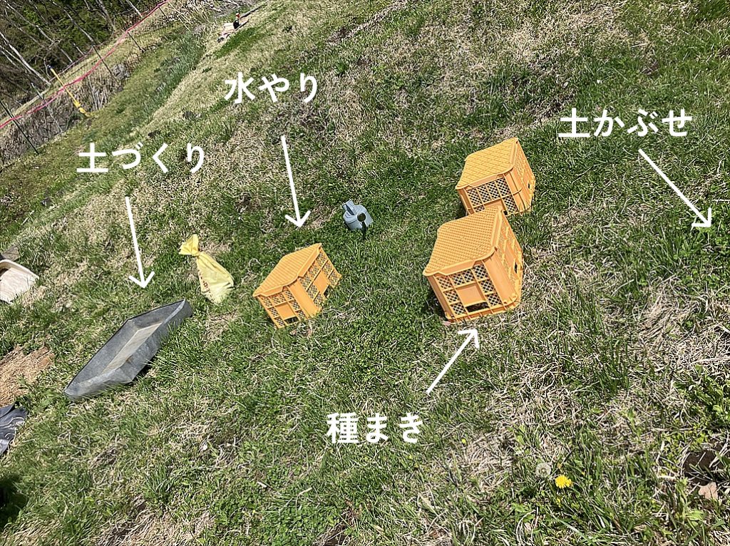 先月の土手補修から一か月、今回の作業は種まき。
