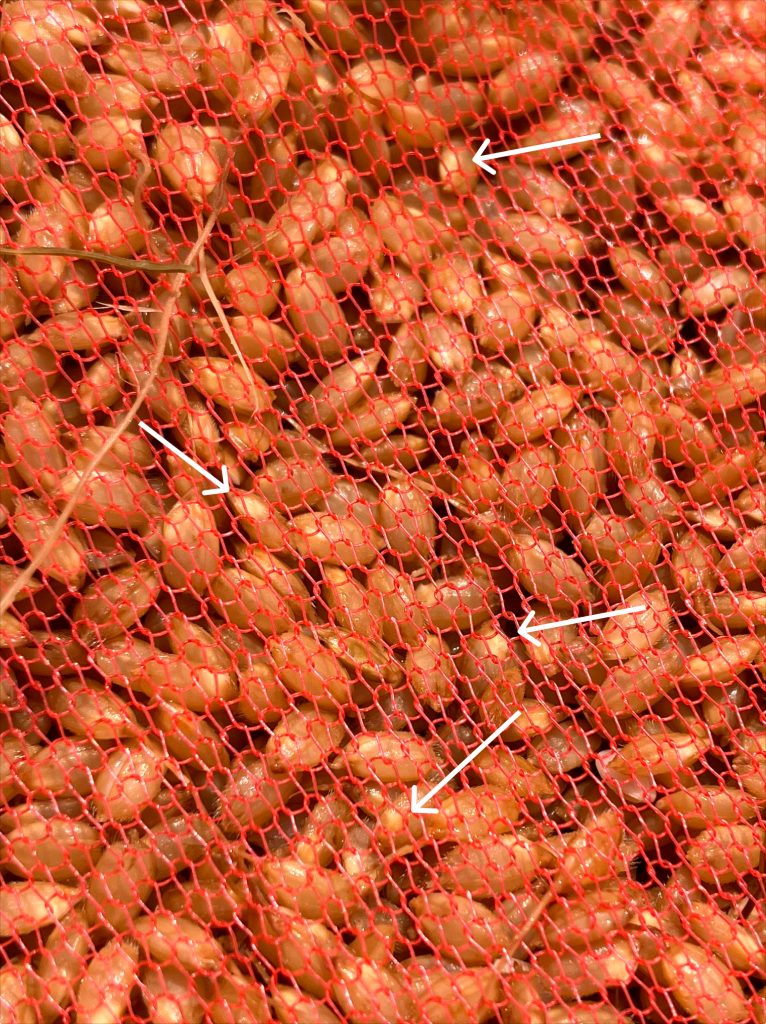 種籾に白いツノが見えるとサインです。網の中でわかりづらいかもですが、チョコチョコありますね。