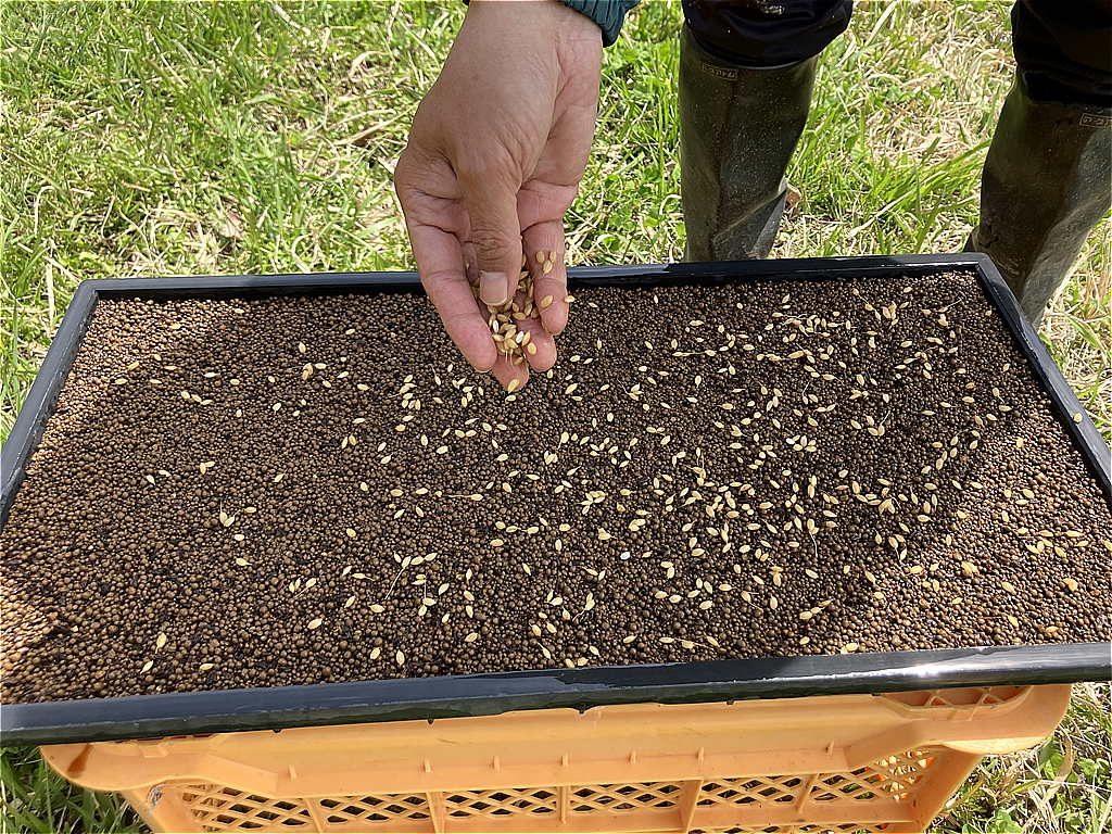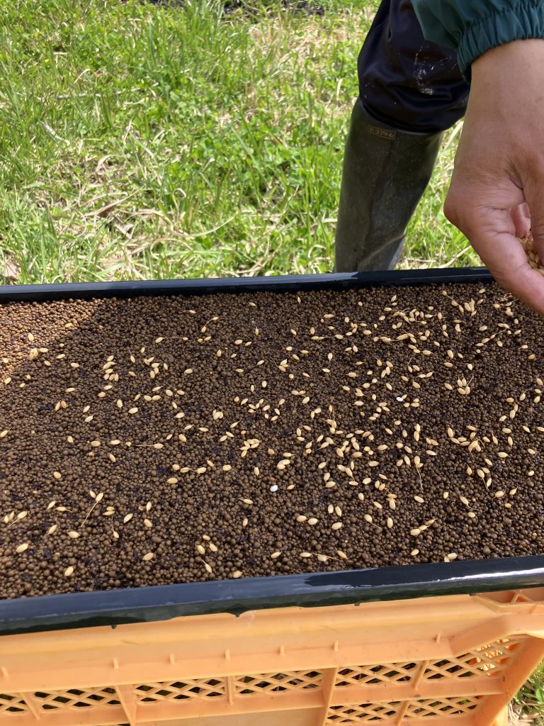 4月の初めに、種もみを選別する塩水選(えんすいせん)という作業をし、その後稲の病気を未然に防ぐ温湯消毒(おんとうしょうどく)をします。そして浸種(しんしゅ)で、発芽を促します。