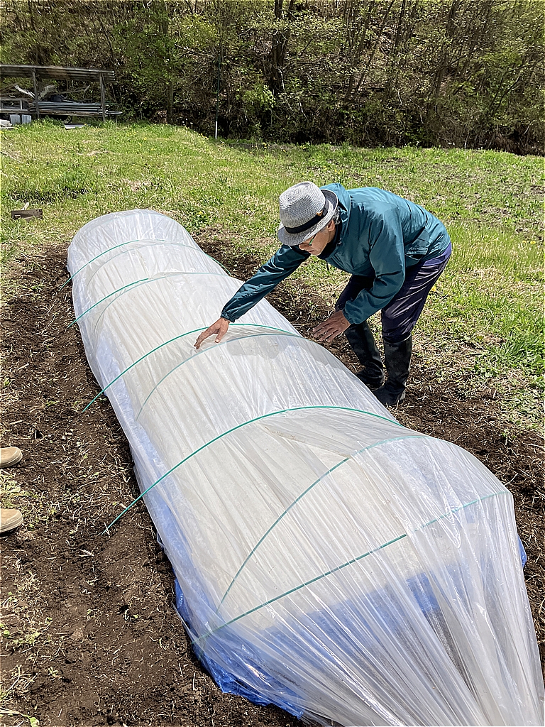 育苗プールとは、苗を育てるためのミニミニビニールハウスみたいなもので、田んぼの下の段に作ります。
