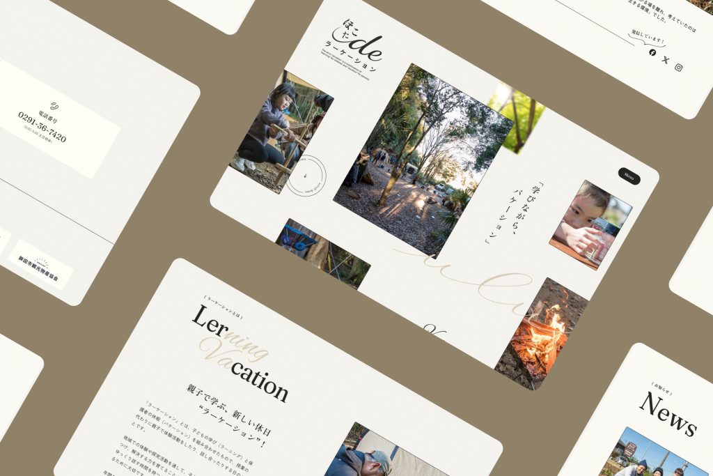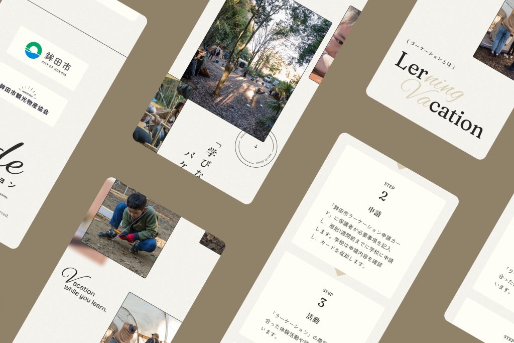 デザインは、「学びと遊び」をテーマに、明るいベージュと自然を感じるテクスチャを基調としています。装飾や賑やかなイラストで親子で学ぶワクワク感を演出。写真を中心としたカード型レイアウトにより、体験プランの魅力が直感的に伝わる構成に仕上げました。