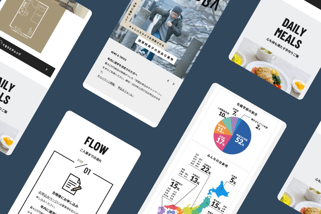 学生生活を快適に過ごせる寮の魅力を、写真やコンテンツを通じて丁寧に紹介。